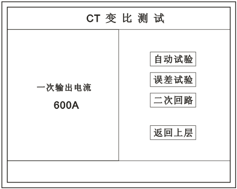 在主菜單界面,旋轉(zhuǎn)鼠標(biāo)將光標(biāo)移動到 CT測試 選項上,按下旋轉(zhuǎn)鼠標(biāo)選擇 CT變比 即可進入變比極性試驗設(shè)置界面(如下圖)。光標(biāo)移動至 返回上層 ,按下鼠標(biāo)即可返回主菜單。